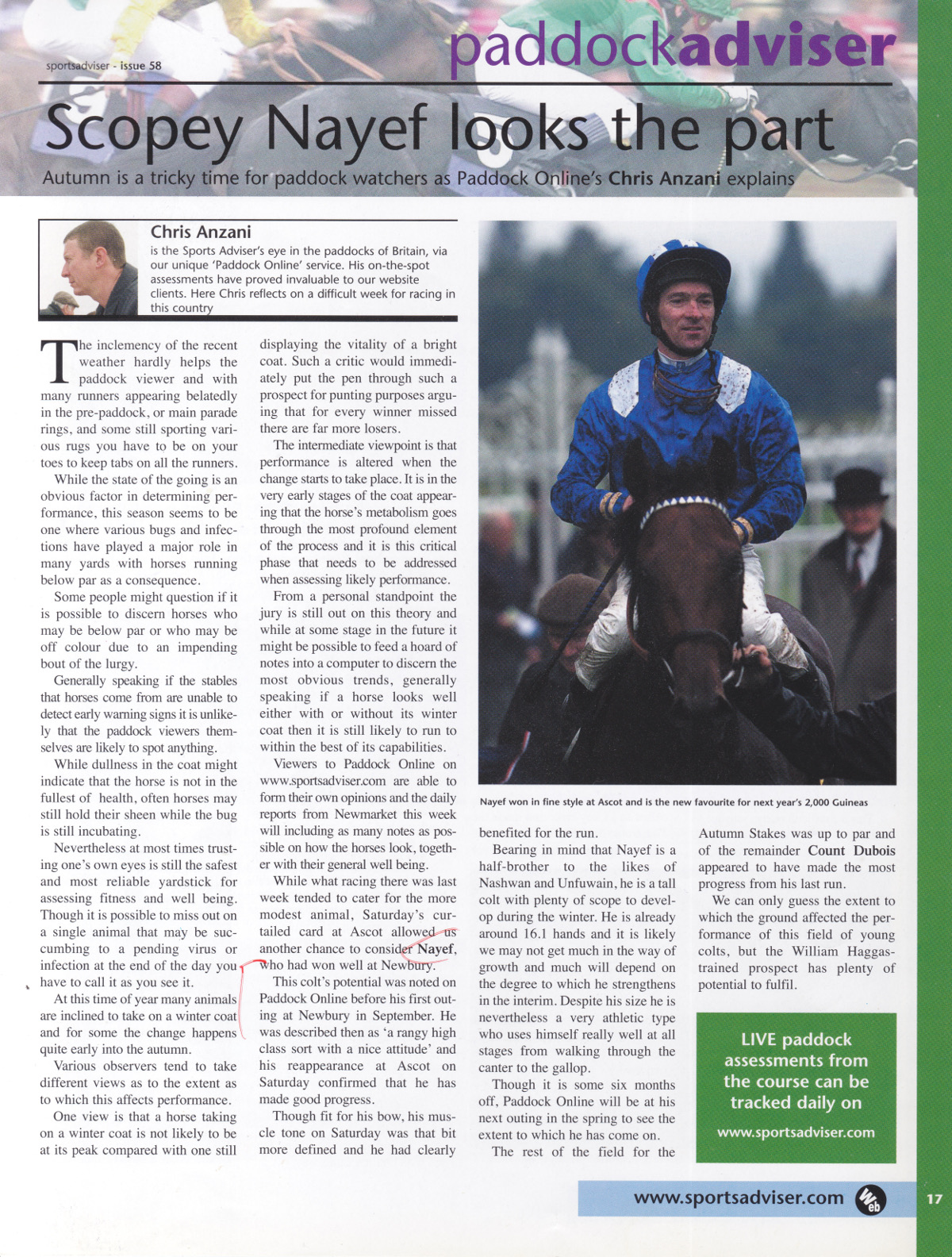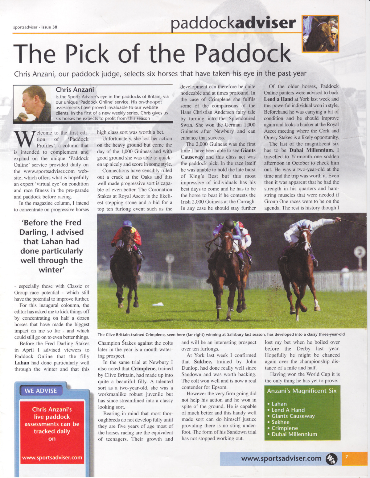 ![]() Issue 38 May 25 2000 The 2,000 Guineas was the first time I have been able to see Giants Causeway and this class act was the paddock pick. In the race itself he was unable to hold the late burst of Kings Best but this most impressive of individuals has his best days to come and he has to be the horse to beat if he contests the Irish 2,000 Guineas at the Curragh. In any case he should stay further and will be an interesting prospect over ten furlongs SA Issue 39 Giants Causeway was beaten on merit and the times for the races suggested that the ground was very nearly good so there were no excuses on that point. Aiden O’Brien was confident enough to relate that the horse now heads for the St James Palace stakes at Royal Ascot to take on victor Bachir and that he expects the horse to progress as the season develops. SA Issue 46 The first edition of Paddock Adviser which appeared in Issue 38 we suggested six horses to follow and a review of the subsequent performances from the nominees has included some fine displays. Giants Causeway was just pipped in the Irish 2,000 Guineas but went on to win the St James Palace Stakes before confirming the confidence held by Paddock Adviser that he would stay the ten furlongs trip of the Eclipse. The Eclipse Stakes, run prior to the Saturday, saw the first crossing of swords between two of the above horses and Giants Causeway prevailed over Sakhee. Paddock inspection gave the nod to the Irish runner by a whisker and he won well. He looked his best yet and should continue to thrive. Sports adviser Issue 56 September 28 2000 Giants Causeway looked in tremendous condition and after being cool for most of the preliminaries started to jig jog and became warm after being mounted. He gave a typically gritty performance, losing nothing in defeat. Having given the horse as one to follow in the inaugural column it now seems light years away as the colt has since assumed a character all of his own and a place in the folklore of the turf. Still, not a bad call. SA Issue 147 July 11 2002 Web users on Paddock Online will remember the description of Giants Causeway before the Sussex Stakes as being ‘big and well’ and Aiden O’Brien indicate after the race that the colt had put on something in the region of 40 kilos in weight. SA Issue 95 July 5 2001 Royal Ascot From the same subversive whose moles extend to every county and parish in the Emerald Isle, came the strongest information of the week. Apparently confidence in Johannesburg representing the Tabor/Magnier/O’Brien combo was sky high and the juvenile colt went off one of the best backed horses of the week. The clear paddock pick, he looks a ‘machine’ and should do well in his first year. It is early days as far as next term is concerned but already the right noises have been made for the Two Thousand Guineas. Sports Adviser Aug 30 2001 Issue 103 It was good to see Johannesburg, described as a machine in Issue 95, take the Prix Morny in style on Sunday. He will be rested before signing of for the year in one of the Autumn Group Ones. |