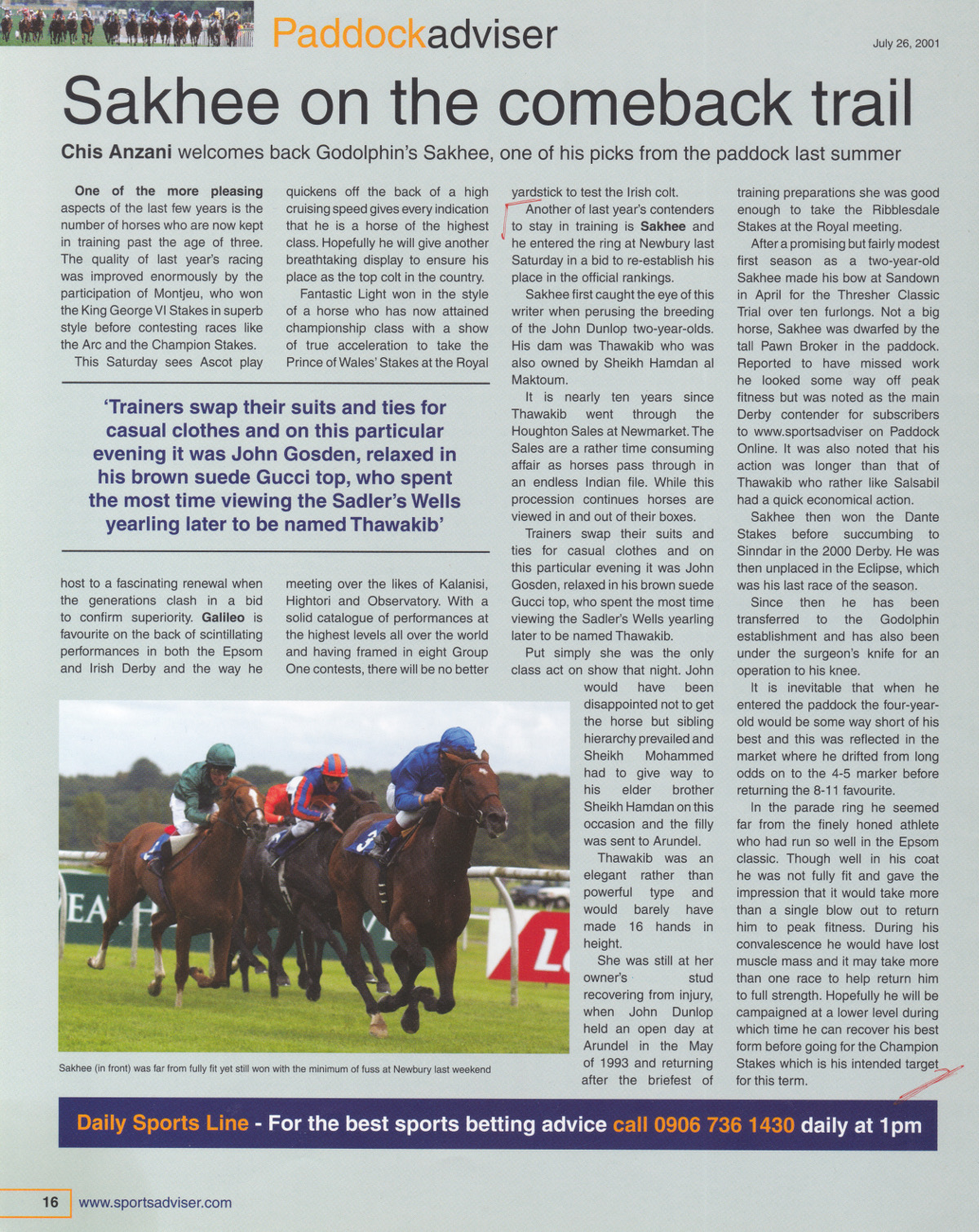 | Issue 38 May 25 2000 At York last week I confirmed that Sakhee, trained by John Dunlop, had done really well since Sandown and was worth backing. The colt won well and is now a real contender for Epsom. However the very firm going did not help his action and he won in spite of the ground. He is capable of much better and this handy well made sort can do himself justice providing there is no sting underfoot. The form of his Sandown trial has not stopped working out. SA Issue 41 Sakhee was flagged up for those who view the Sportsadviser Website after his appearance at Sandown in April and was included in the list of horses to follow in this column a few weeks ago. The colt fulfilled all expectations by finishing in second place, five lengths clear of the third. It would have been nice to win but he simply found one too good on the day. SA Issue 46 July 20 2000 Sakhee gave a gallant display in the Derby and finished clear of his field when second to Sinndar who subsequently slaughtered the opposition in the Derby. Likewise Sakhee was in supreme order and could not be faulted in the parade ring. There was no indication that his Epsom exertions had taken anything out of him and his running was disappointing. Perhaps the rapidly drying ground was against him and it may be possible that he will always need a bit of cut to be at his best, while a distance of 12 furlongs could be his optimum trip. In all he deserves another chance. SA Issue 62 9 November 2000 Sakhee was unlucky enough to meet Sinndar in the Derby and that colt proved himself to be the best Classic horse to have come out of Ireland since the peerless Nijinsky some 30 years ago. Sakhee came clear of the rest of the field but it was not enough to land this writer a six figure punt. SA Issue 98 26 July 2001 Another of last year’s contenders to stay in training is Sakhee and he entered the ring at Newbury last Saturday in a bid to re-establish his place in the official rankings. Sakhee first caught the eye of writer when perusing the breeding of the John Dunlop two year olds. His dam was Thawakib who was also owned by Sheikh Hamdan al Maktoum. It is nearly ten years since Thawakib went through the Houghton Sales at Newmarket. The Sales are a time consuming affair as horse pass through in an endless Indian file. While this procession continues horses are viewed in and out of their boxes. Trainers swap their suits and ties for casual clothes and on this particular evening it was John Gosden, relaxed in his brown suede Gucci top, who spent the most time viewing the Sadlers Wells yearling later to be named Thawakib. Put simply she was the only class act on show that night. John would have been disappointed not to get the horse but sibling hierarchy prevailed and Sheikh Mohammed had to give way to his elder brother Sheikh Hamdan on this occasion and the filly was sent to Arundel. Thawakib was an elegant rather than powerful type and would barely have made 16 hands in height. She was still at her owners stud recovering from injury when John Dunlop held an open day at Arundel in the May of 1993 and returning after the briefest of training preparations she was good enough to take the Ribblesdale Stakes at the Royal Meeting. After a promising but fairly modest first season as a two year old, Sakhee made his bow at Sandown in April for the Thresher Classic Trial over ten furlongs. Not a big horse, Sakhee was dwarfed by the very tall Pawnbroker in the paddock. Reported to have missed work he looked some way off peak fitness but was noted as the main Derby contender for sunscribers to www.sportsadviseron Paddock Online. It was also noted that his action was longer than that of Thawakib who rather like Salsabil had a quick economical action. Sakhee then won the Dante Stakes before succumbing to Sinndar in the 2000 Derby. He was then unplaced in the Eclipse which was his last race of the season. Since the he has been transferred to the Godolphin establishment and has also been under the surgeon’s knife for an operation to his knee. It is inevitable that when he entered the paddock the four year old would be some way short of his best and this was reflected in the market where he drifted from long odds on to the 4-5 marker before returning the 8-11 favourite. Sport Adviser 30 August 2001 Issue 103 There were some good winners during the week sufficient to pay for the bacchanal. Sakhee started proceedings on the Tuesday though bets were subdued by the fear that the Grade One race may come too soon after the colt’s win at Newbury where he was less than fully fit. Pre race inspection revealed that the son of Bahri had done well since the outing and had filled a deal but the description ‘big and well’ may have been more pertinent rather than ‘hard fit’ and there was some trepidation on the part of this writer as Sakhee was being asked to take on a top class field when less than fully fit. Such doubts were unfounded as he won in fantastic style decimating the opposition. The inference is that the best is yet to come and Sakhee should win again in the Champion Stakes or the Arc. There was no scope to belittle the race as Medicean looked magnificent beforehand and both Black Minaloushe and Grandera had done well physically. Readers of this column will need no introduction to Sakhee as he was the nominee for the Derby last year in the inaugural column at a time when Kings Best was still favourite. Though he was no match for Sinndar he was clear of the rest of the field at Epsom and the form was good enough to win the Arc, barring the Currabeg colt. Having improved again the Arc is his for the taking this autumn should connections declare him – even allowing for the running plans of Ballydoyle. SA Issue 162 October 24 2002 The race (Champion Stakes) was devalued by the omission of Sakhee who was retired to stud before the race. His career was traced closely in this column and his win at Longchamp in the Arc capped a brilliant career over mi