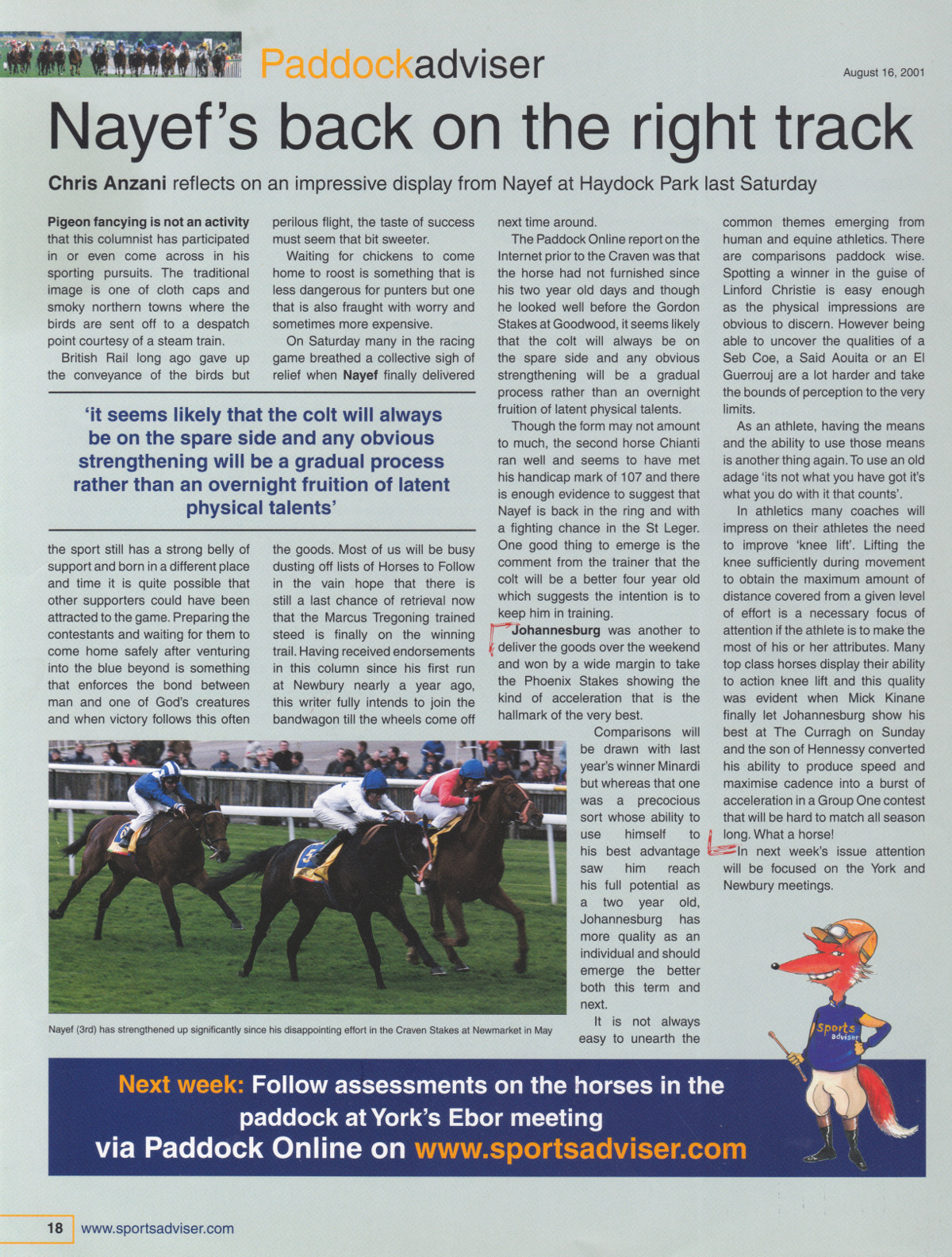 Sports Advisor 16/08/2001